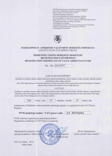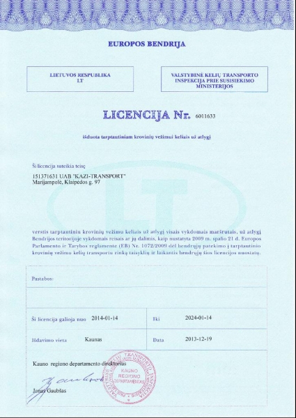 Documents EU license - DOWNLOAD VAT registration certificate - DOWNLOAD The Certificate of state registration - DOWNLOAD CMR insurance policy - DOWNLOAD